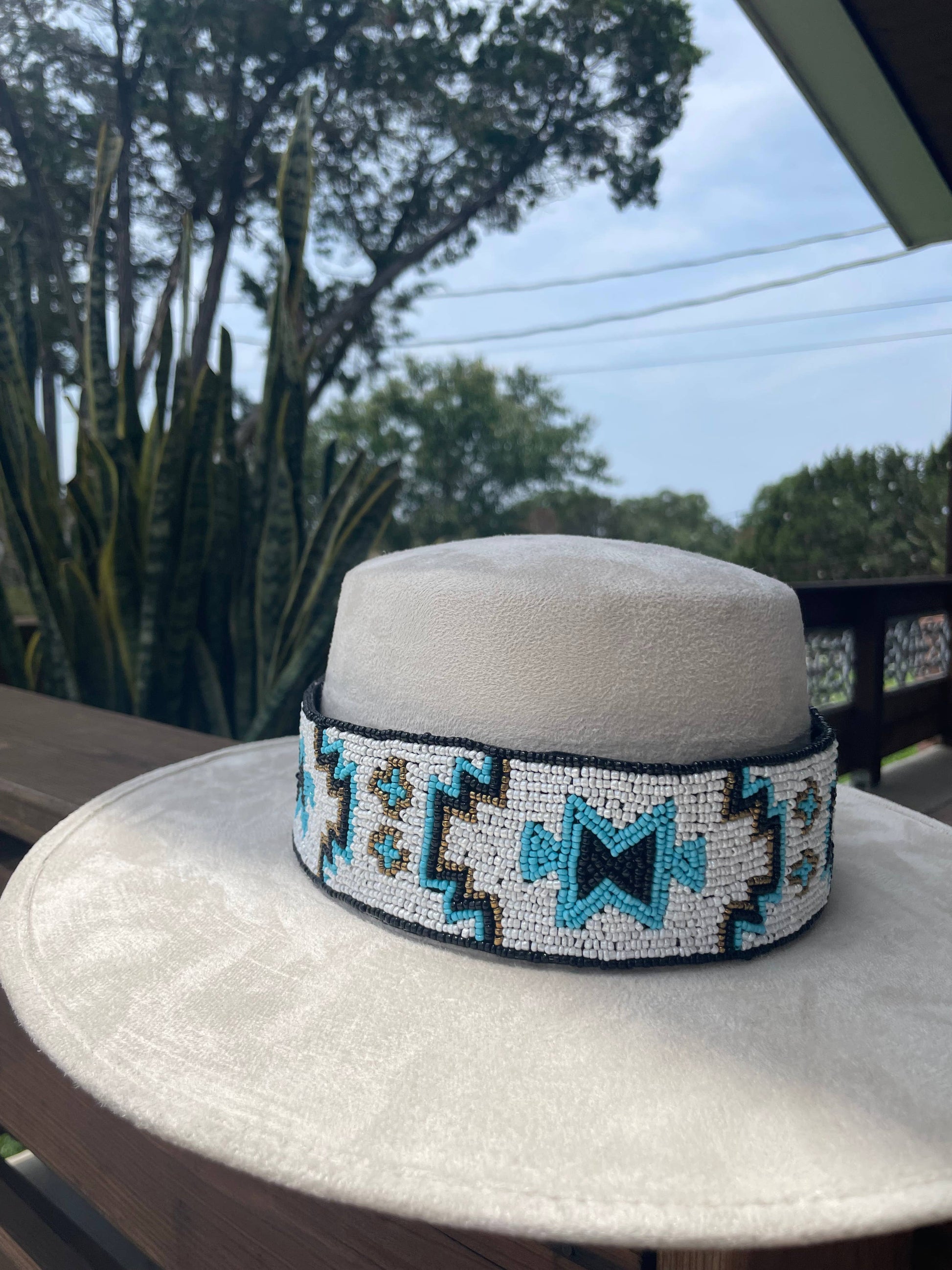 Up your accessories status with our Hand beaded southwest belt or hat band. Exclusive design by us made with a velvet canvas backing and fringe tie.